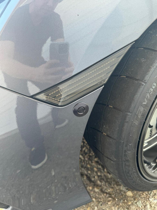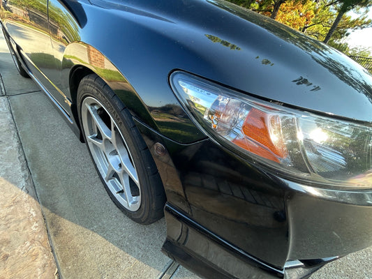 On top of that, with the bumper bands, going anything over 100 (on a closed course, of course), my entire front end would scrape against the ground because of the down force generated by my front splitter. That, or bottoming out, and I'd have to go fix and realign my bumper which would go over my headlights. These things are rigid, in all of the ways I want them. They don't move a bit, unless I depress the release button.